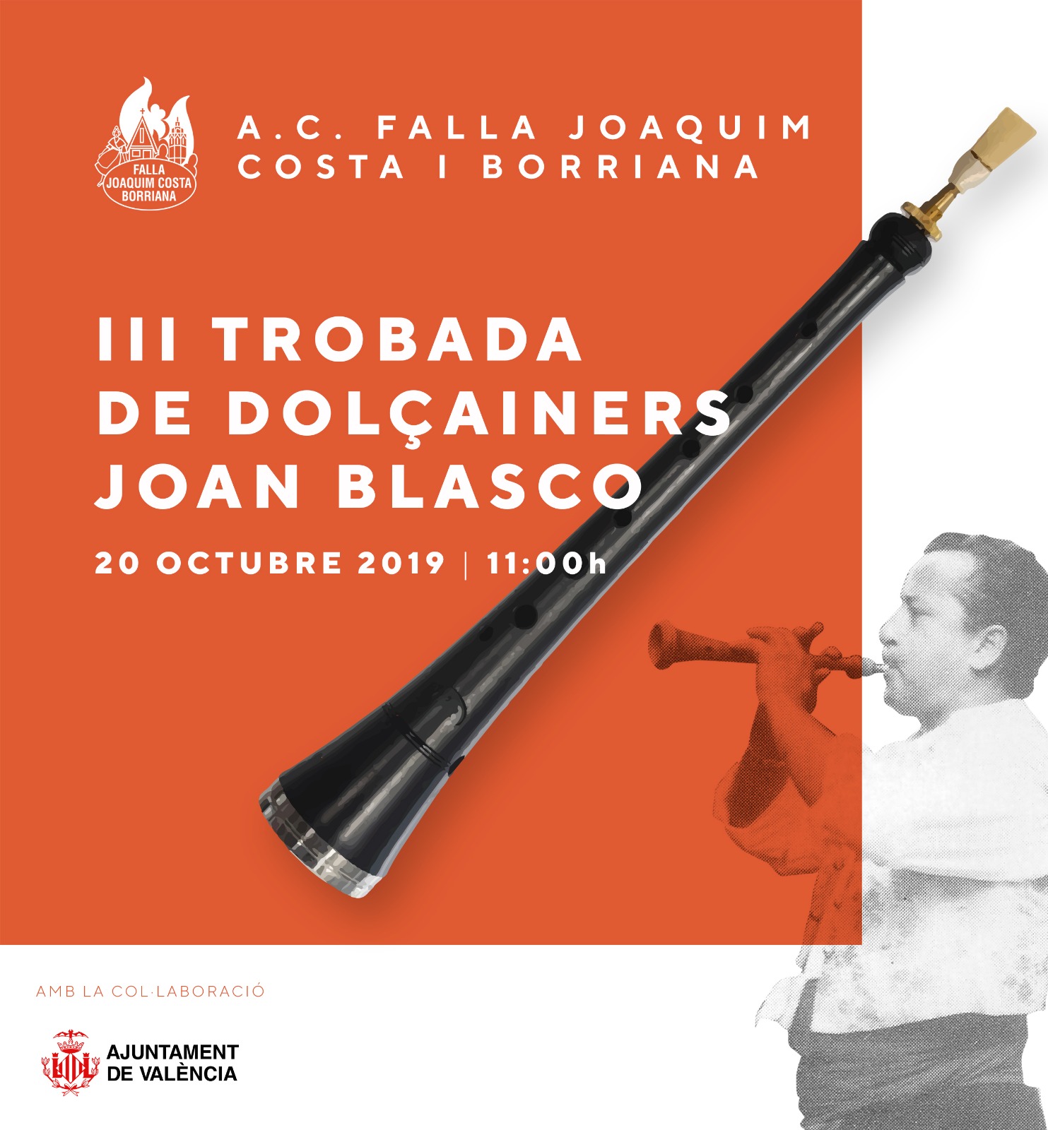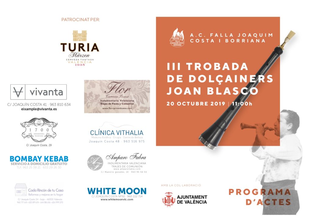 La Falla Joaquín Costa Borriana, un año más, retoma el homenaje con la presente Trobada de Dolçainers al gran Dolçainer JOAN BLASCO. Es muy importante para nosotros mantener viva la memoria y el recuerdo de este gran músico valenciano.
